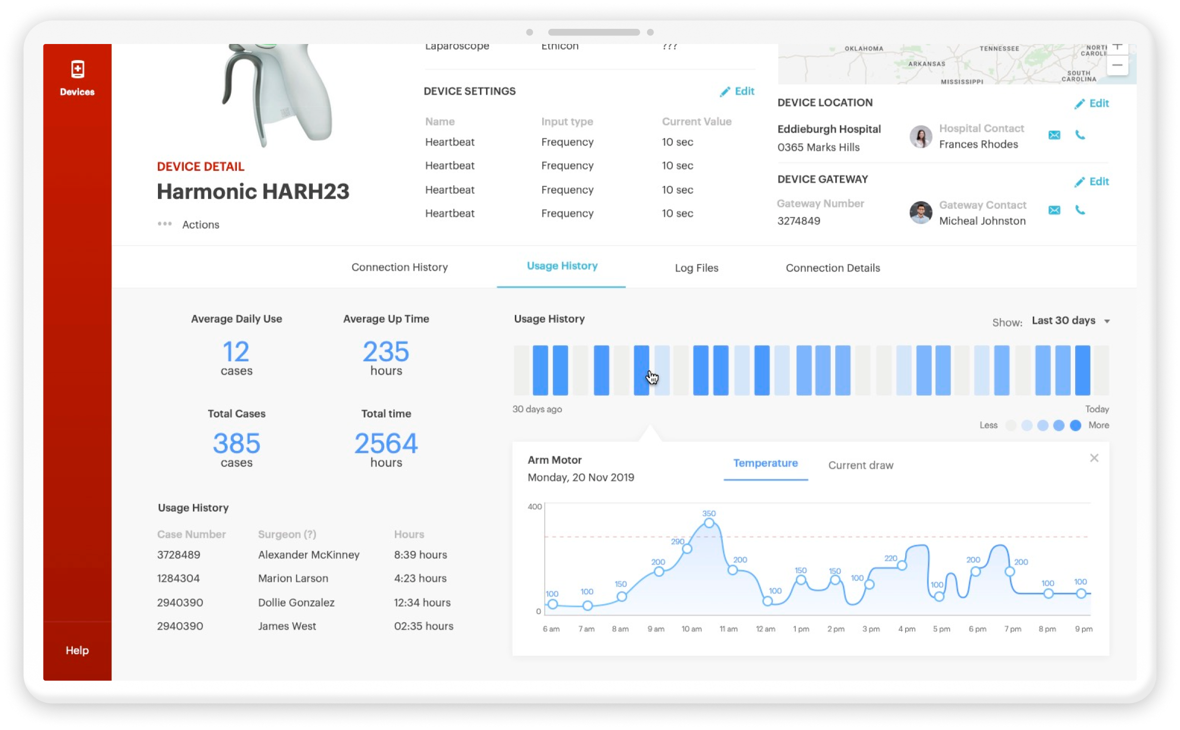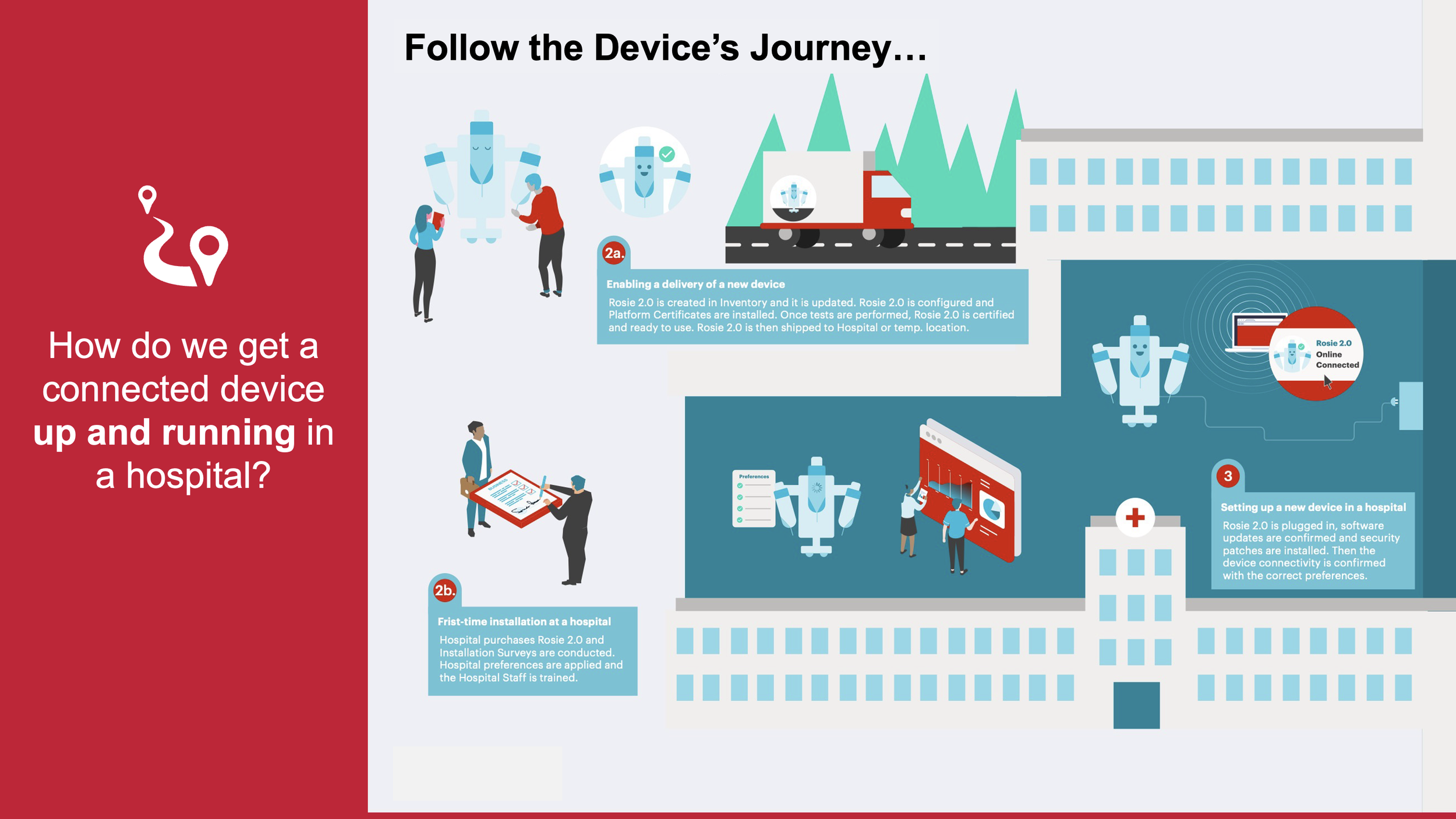 A device installation journey illustrating actions, roles, and touchpoints inside hospitals